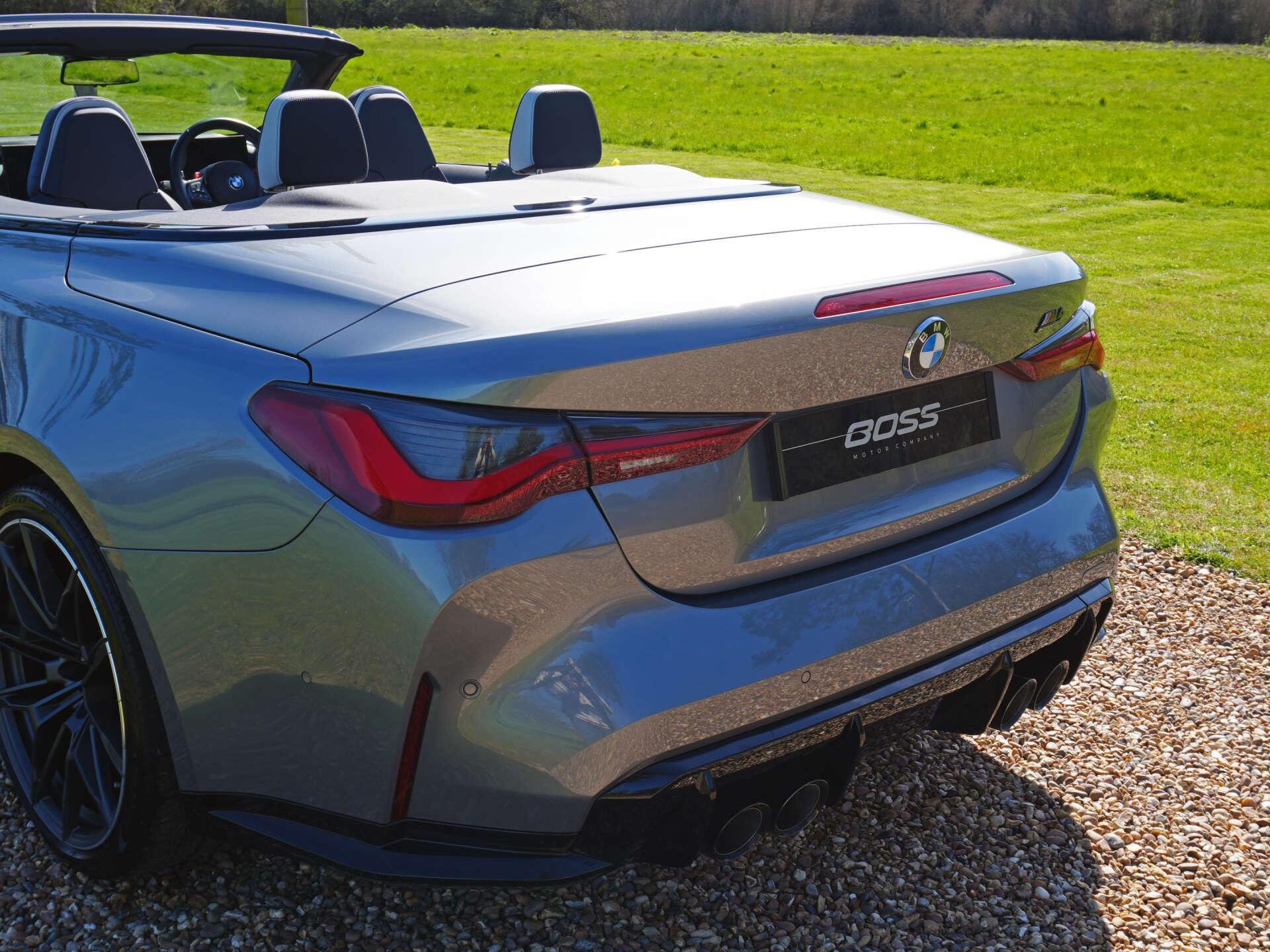 2023 (73) BMW M4 Competition Convertible Auto 13,600 miles – 1 owner from new – Full BMW main dealer service history Finished in Skyscraper Grey with Silverstone and Black Merino leather interior, this one-owner M4 Competition Convertible combines open-top performance with a strong factory specification including Technology, Visibility and Comfort packages. Key details: - 2023 / 73 plate - 13,600 miles - M4 Competition Convertible - 3.0-litre twin-turbocharged straight-six petrol engine (503 bhp) - 8-speed automatic transmission - M xDrive all-wheel drive Specification highlights: - Skyscraper Grey exterior - Silverstone and Black Merino leather interior - Carbon fibre interior trim - Wind deflector - 19" front / 20" rear staggered alloy wheels - Wireless Apple CarPlay & Android Auto - M Sport seats with memory - Heated front seats - Cruise control with braking function - Ambient interior lighting - Technology Package - Head-up display - BMW Live Cockpit Professional - Gesture control - Enhanced Bluetooth & wireless charging - Comfort Package - Comfort Access (keyless entry) - Heated steering wheel - Extended storage package - Visibility Package - Adaptive LED headlights - High Beam Assist History & ownership: - 1 owner from new - Full BMW main dealer service history Disclaimer: Whilst every effort has been taken to ensure accuracy of all our vehicles information, some inaccuracies may occur. It is important that you do not rely on this information but check with Boss motor company limited about any items which may affect your decision to buy this vehicle. Fuel consumption and power usage figures are for guidance only. Factors such as driving style, weather, loading, traffic conditions, all affect the rate at which fuel or power is consumed. It is likely that some journeys will result in greater fuel consumption for the same distance than other journeys. You would be wise to ensure the power range remains above 20% at all times. -